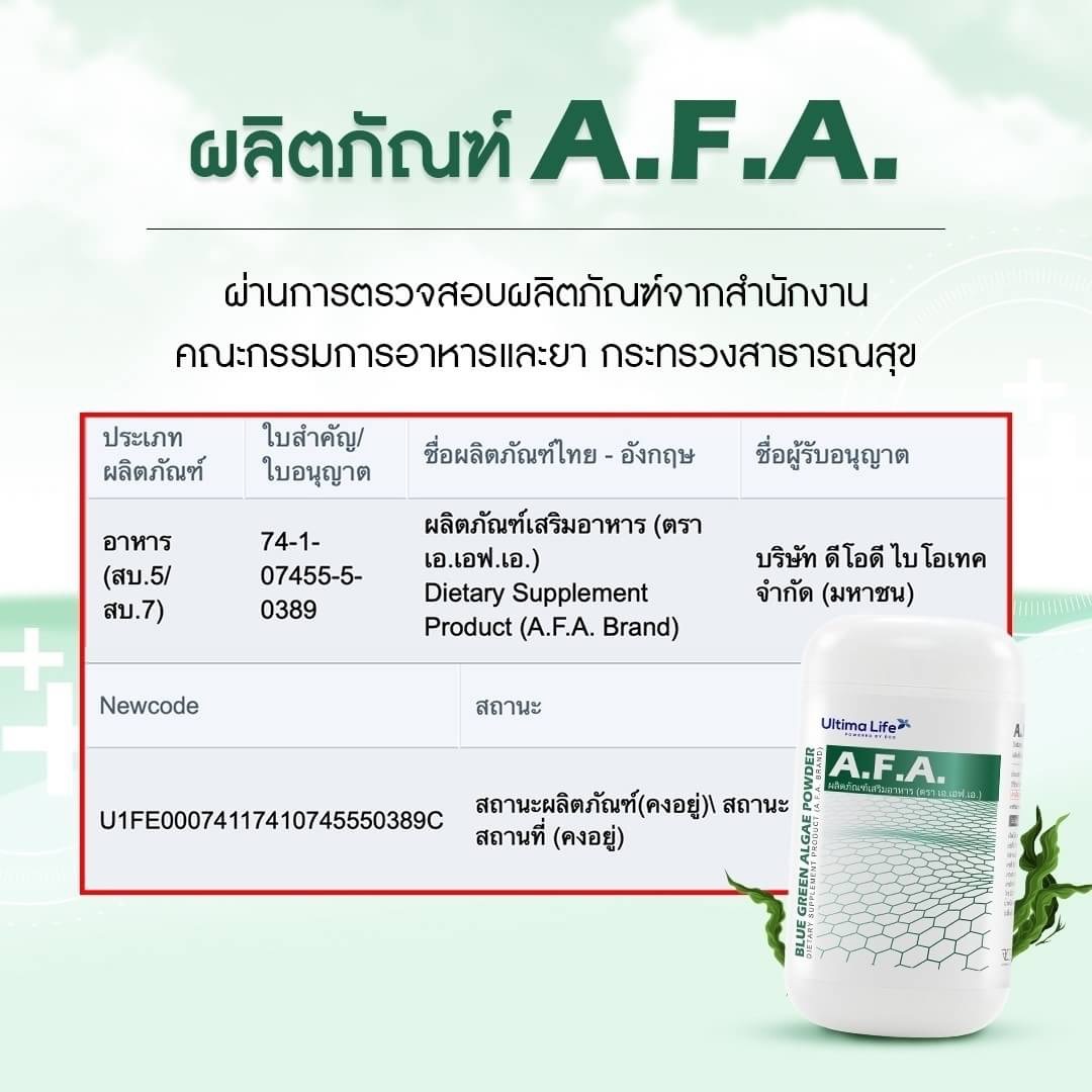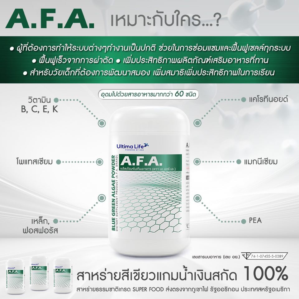ผลิตภัณฑ์เสริมอาหาร ตรา A.F.A (Aphanizominon Flos-Aquae) :บำรุุงร่างกาย / เสริมสร้างระบบภูมิคุ้มกัน Super Food สาหร่ายธรรมชาติ จากภูเขาไฟรัฐ Oregon,USA. วิตามิน แร่ธาตุ กรดอะมิโน เอนไซม์ กรดไขมันโอมเมก้า 3,6 ครอโรฟิลล์ RNA/DNA เบต้าแคโลทีน Complex Cards Phenylethylamine (PEA)